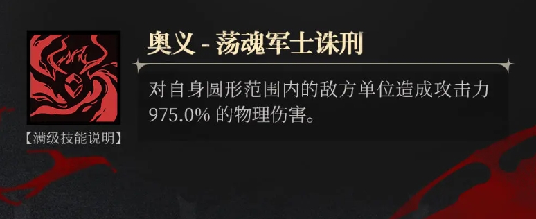 而当拜冯特的奥义技能叫做荡魂军士诛刑,这一技能需要消耗4点奥义点数,但所带来的输出确实是很高的,使用的时候拜冯特会将体内的火焰之力提升到极致,然后旋转巨斧,这些斧风此时会给拜冯特周围的所有敌方单位都带来输出效果,敌人将承受高达975%攻击力数值的物理伤害,这一伤害数值和素质还是很高的。