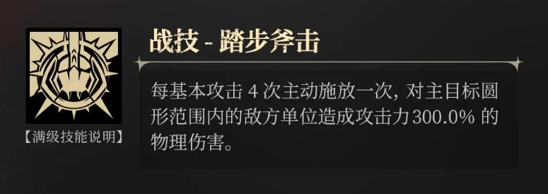 他的战技叫做踏步斧击,这一技能需要他在进行四次基本攻击后才能主动释放,但一旦发动之后拜冯特会高高跃起,然后向选定的目标劈去,巨斧会对选定的目标以及周围圆形范围内的所有敌方单位造成输出,且其中的目标都将承受高达300%攻击力数值的物理伤害,这一技能的范围之大确实很少有角色可以做到,且伤害也是高的,使得拜冯特在面对群体敌人时能够发挥出足够的杀伤力。