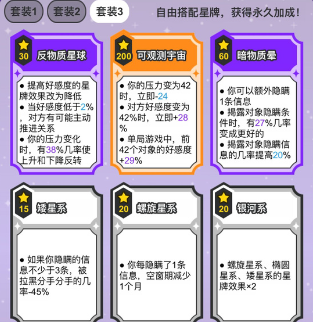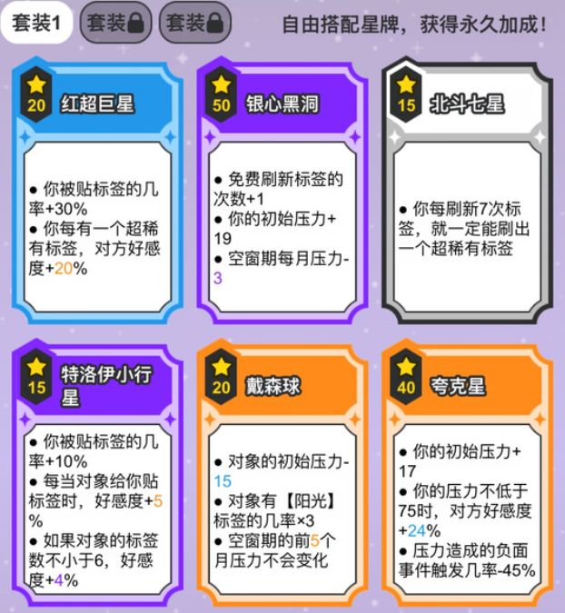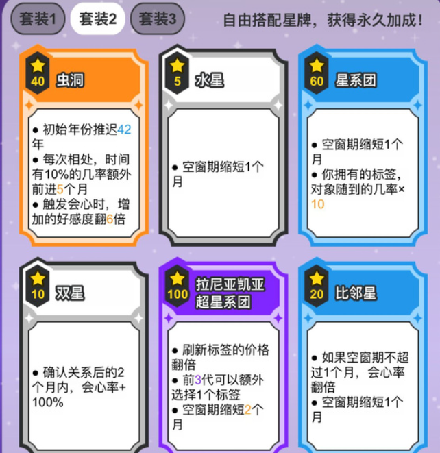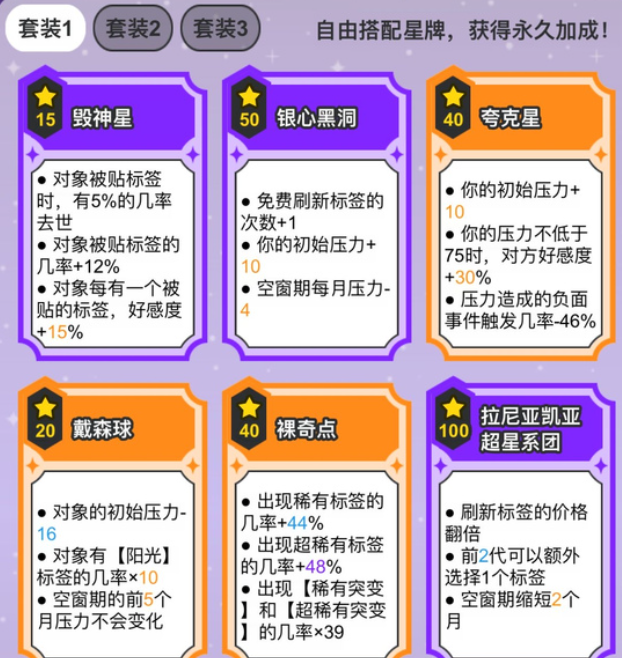 核心是毁神星以及橙色的银心黑洞,这一套新牌流派,会使得玩家的空窗期压力增长数额为零,所以可以不断地切换人员,通过增加前任的标签,就可以直接提升对方的好感度,从而增加自己在相亲市场当中,被青睐的概率。