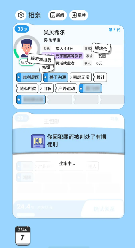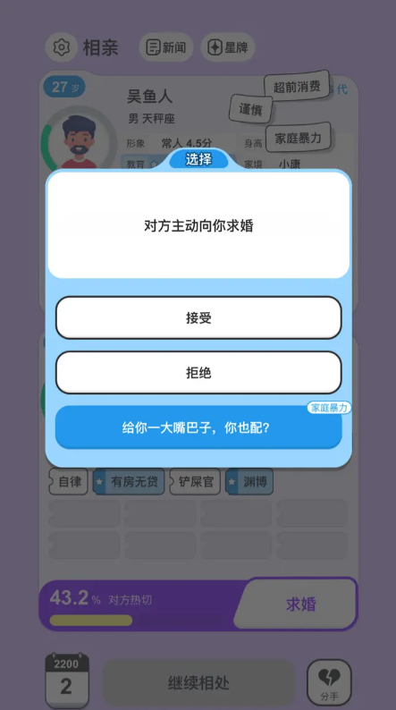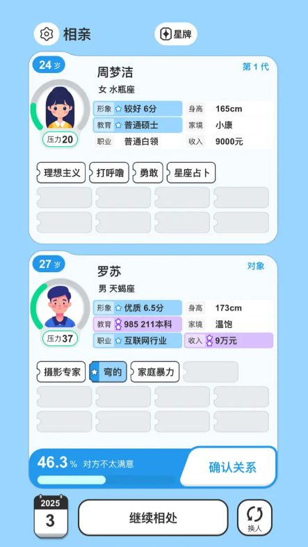 同时,玩家需要隐藏一些负面的标签,例如迷信观念,亦或是身体隐患等等,当然,玩家可以通过购买婚介所会员卡的方式,来增加自己在游戏内成功相亲的效率。