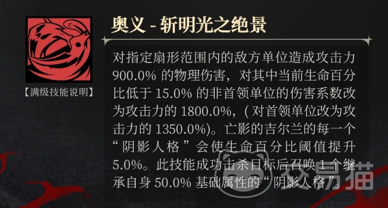 吉尔兰的冲锋会对沿途遇到的敌方单位造成300%的物理伤害,这一范围伤害效果使得吉尔兰在冲锋过程中也能对周围的敌人形成有效的打击,扩大了他的攻击范围和杀伤力,而吉尔兰自身在发动奥义技能后,还会获得角尖起舞状态,这个状态一样是持续10秒钟,角尖起舞状态所带来的效果与战技触发时的角尖起舞状态如出一辙,在这个状态下吉尔兰的战斗力得到增强,不过大家注意,他的奥义技能与战技所带来的角尖起舞状态也存在一定的区别,奥义技能的一个显著优势在于它可以完全由玩家指定目标,这意味着玩家无需担心对方的阵型布局啦。
