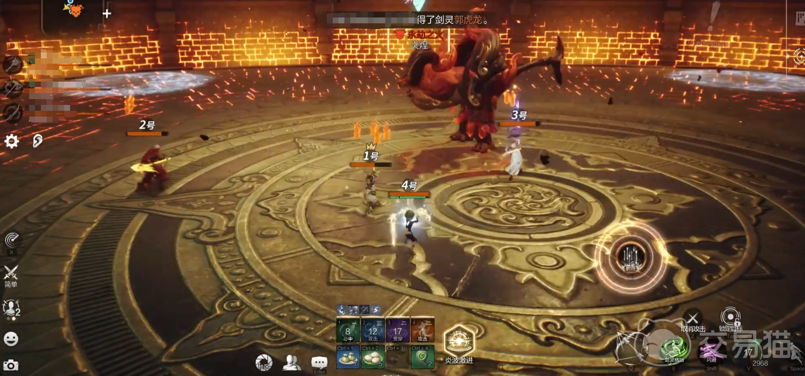 修罗级炎煌的伤害量比普通的要高不少,更重要的是要了解它的机制,首先,炎煌的第一个技能是随机向每个玩家释放火球,被命中的玩家头顶上就会悬挂出火球的标记,当记号数量到达四个以后就要去地图边上的冷气处冰冻一下,不然会持续掉血,所以战斗的时候要关注头顶的火球数量。其次,炎煌在打一段时间以后会进入无敌状态,需要在地图里收集沙漏来打破其防御。