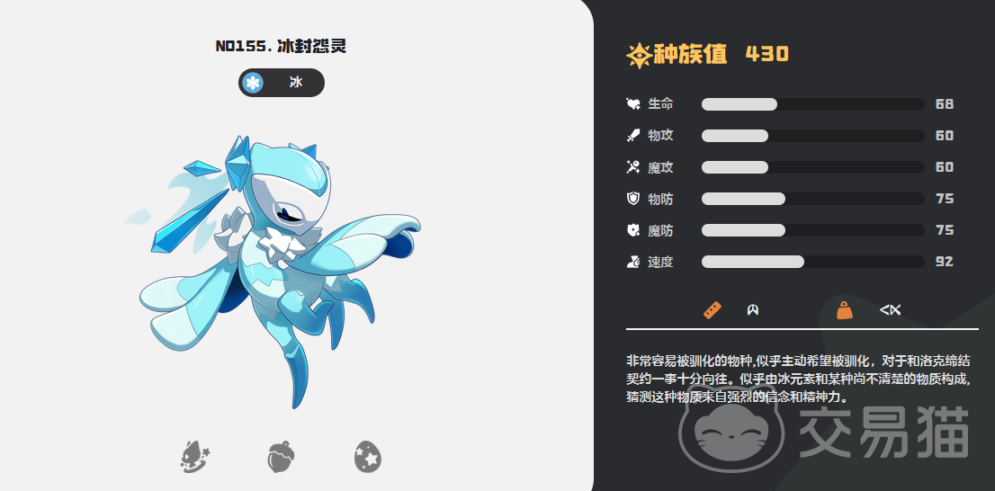 冰封怨灵是由雪娃娃26级后进化得到的精灵,它的特性是冰封,只要自身在场上,那么敌方所有的技能消耗就会增加两点。资质方面并不高,总资质也只有430,其中生命68、物攻60、魔攻60、物防75、魔防75、速度92,除了速度有些优势之外,其他都非常一般。不过因为它的特性确实非常强大,所以资质方面就不再是问题。