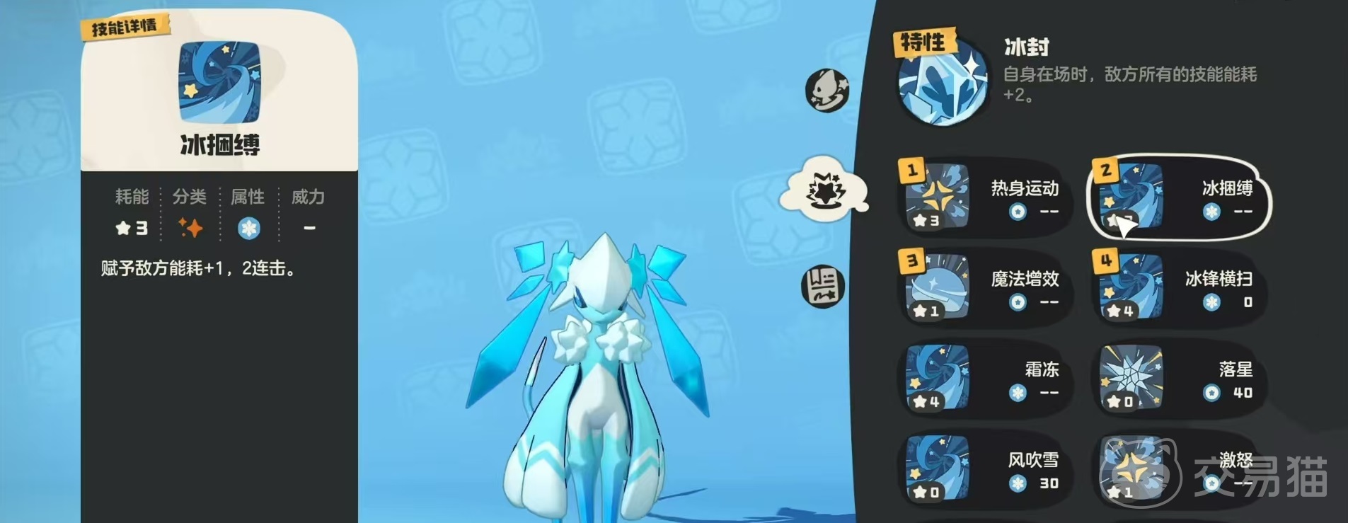 在技能方面,自身有很多技能也都可以配合自身的特效发挥出作用,例如操控,使敌方本回合释放的技能能耗加6;聒噪,使敌方所有攻击技能能耗加速;摇篮曲,赋予敌方能耗加3,应对防御时会眩晕敌方一回合;激怒,敌方除了本回合释放的技能之外,其他技能能耗加4点;碎冰击,造成物伤,敌方所有技能能耗加1点;冰冻光线,造成魔伤,敌方所有技能能耗加2点;冰捆缚,赋予敌方能耗加1,2连击。