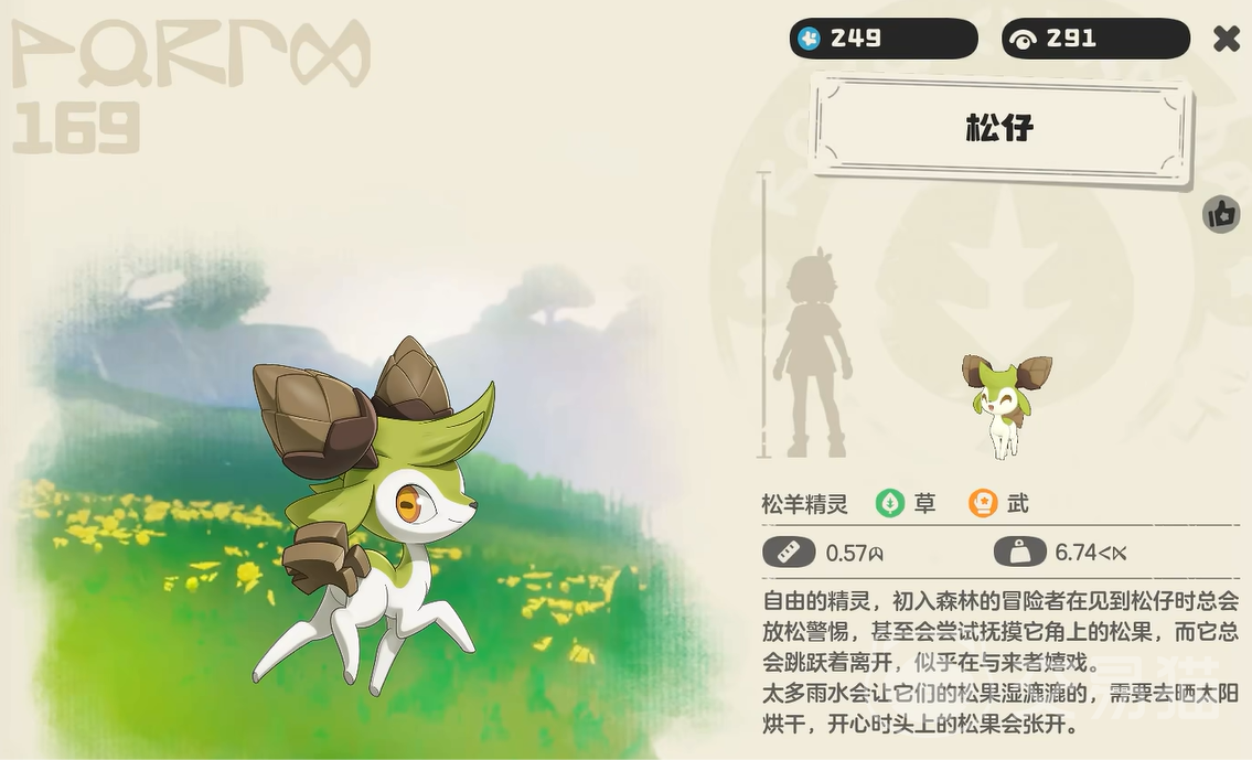 松仔是一只犹如小鹿一般可爱娇小的精灵,并且它的属性也是草属性,所以作为一只松羊精灵,一经问世就捕获了不少小伙伴的芳心。他头顶上的松果偶尔也会张开,主要是为了烘干雨天带来的雨水。另外初入森林后,看到冒险者们他也会自己离开,比较害羞。