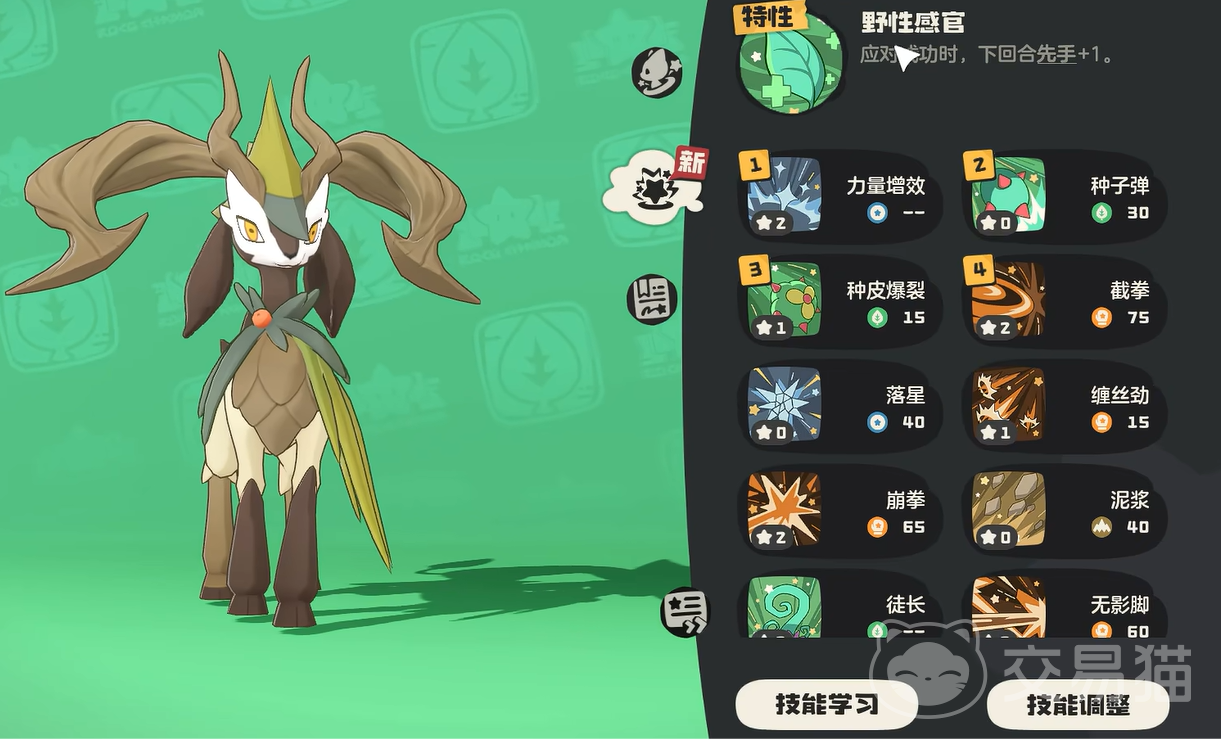 当大家将这只精灵喂养至40级之后,那么就可以进阶成为针叶巡林,这是一只有如山羊一般雄壮的精灵。并且生命值也很高,特性叫做野性感官。当你应对成功时,就可以获得一次的先手机会。作为一支力量型精灵,他的技能也偏向于增加力量并造成草系伤害。
