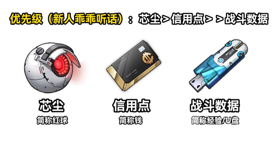 首先就是角色的升级,这个升级的渠道很多,基本上就是获取各类型的强化素材,主要的获取渠道有主线任务,然后是防御前哨基地,这个基地只要每天登录都可以获得很多的补给,然后就是多打打各种类型的副本,其中三个材料最为重要,分别是芯尘,信用点以及战斗数据,这三个道具是强化所有角色的材料,而且消耗量很大,建议新手们可以多多获取。