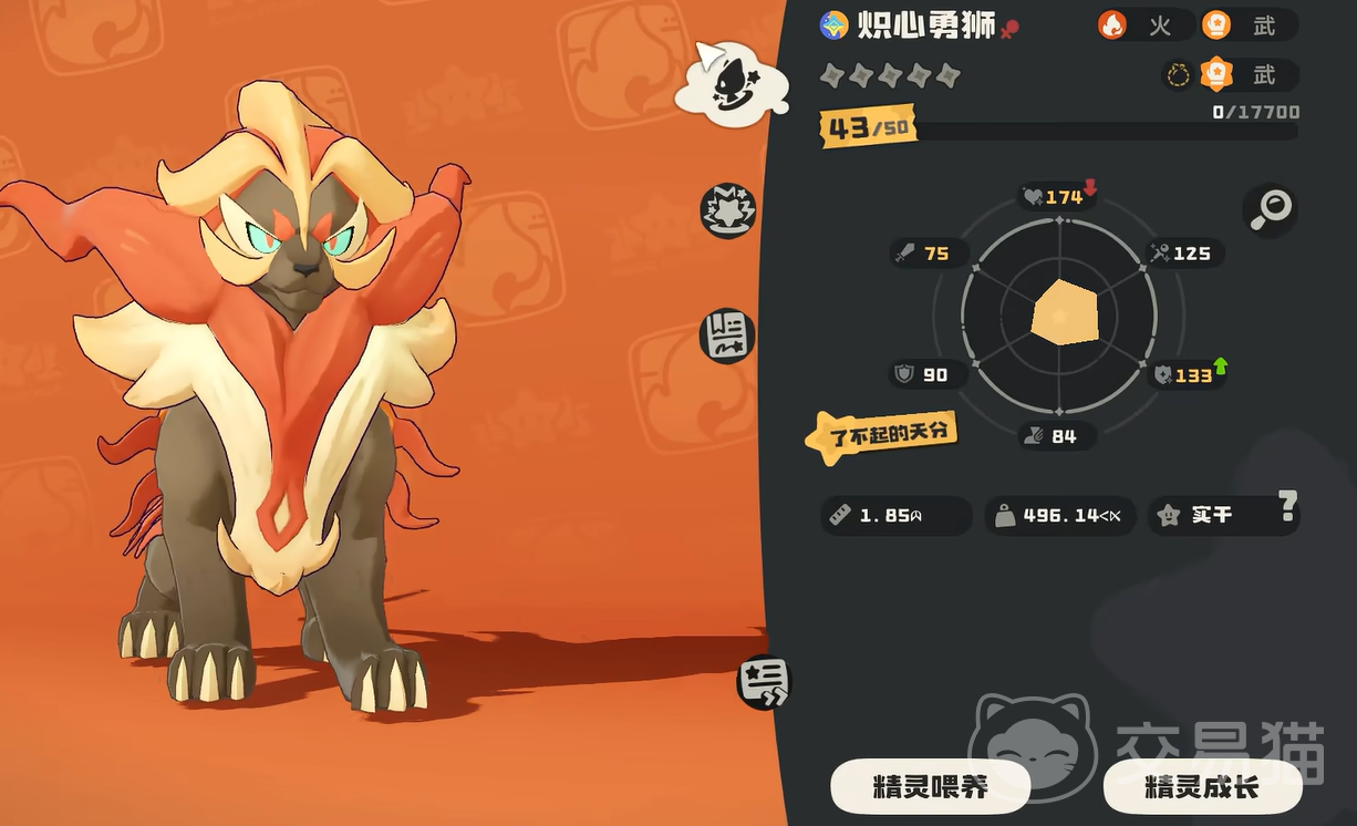 大家如果觉得年幼的狮子战斗力弱的话,也可以选择培养并喂养它大量的食物。当他的等级提升至36时,就可以直接进阶为终极形态,也就是炽心勇狮。他的攻击力其实特别高,在同类精灵中算是都一档了,所以战斗能力强悍。