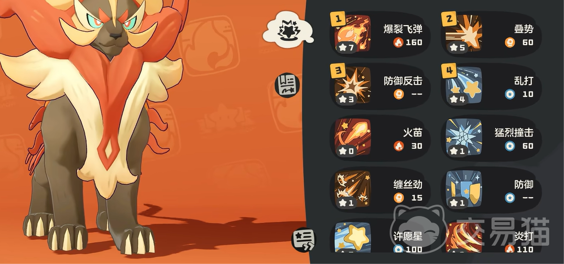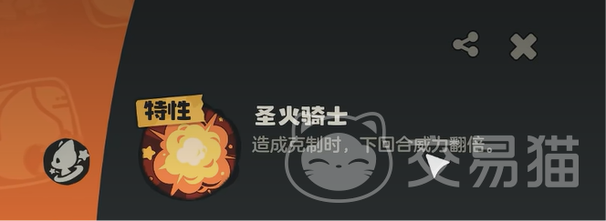它的特性叫做圣火骑士,如果成功克制对方的精灵时,下一回合的伤害将直接翻倍。所以面对水属性敌人时,用他的话可以造成高额的爆发伤害。另外他的技能叫做爆裂飞弹,用了之后可以造成高额的火属性伤害。