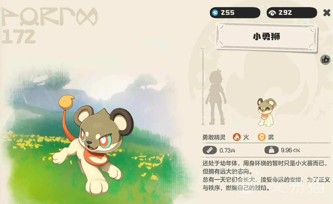 大家想要获取这只年幼的狮子也不难,只要将任务做至洛克里安。并且在对话选择精灵时,大家选择第二个御三家。并且与小狮子进行对话,这时他就会用力地挺起胸脯,向你介绍他是一名骑士。当你感受他不断燃烧的勇气之后,自然可以获得他的精灵果实了。