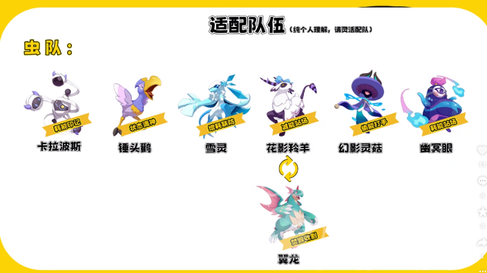 在搭配队伍方面也需要引起注意,例如可以选择卡拉波斯加上锤头鹳。这两个精灵可以各司其职,能够构建一个强大的战术体系。除了这两个精灵之外,玩家还可以选择花影羚、幻影灵菇。在正确的搭配之后,就可以发挥一个较强的效果。在实际对战的过程中可以先卡拉波斯一开局去叠加印记,如果遇到比较强大的对手就可以及时的更换雪灵控制。进入到中期之后也可以及时的切换锤头鹳、花影羚羊等精灵,能有效起到一个压制的作用。