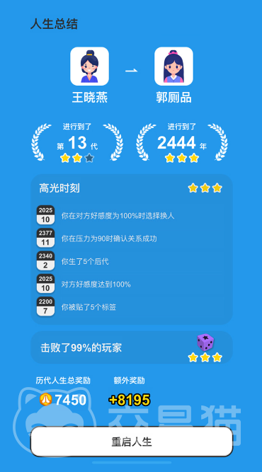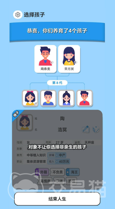 由于在游戏内玩家们将会不停的传宗接代,因此在获得了下一代之后,小伙伴们也需要为自己的下一代精心挑选合适的伴侣,尽可能的使自己的家族一直传承下去,如果说在某一代之后你未能获得合适的伴侣,这也就意味着游戏结束了,因此小伙伴们在游戏里一定要注意遗传哦。