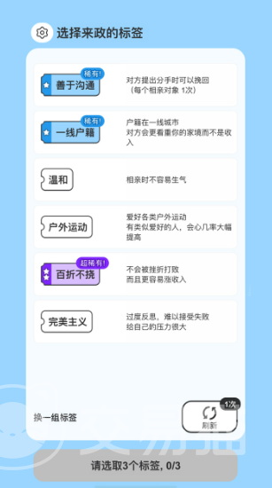 接下来小伙伴们就可以进入到相亲市场了。在这里系统将会随机为你安排一些角色,他们在性格属性方面都有很大的区别,小伙伴们可以根据自己的喜好来选择,你认为最合适的结婚对象。当选择完成之后,你将会与自己的另一半一起进入到人生的下一阶段。