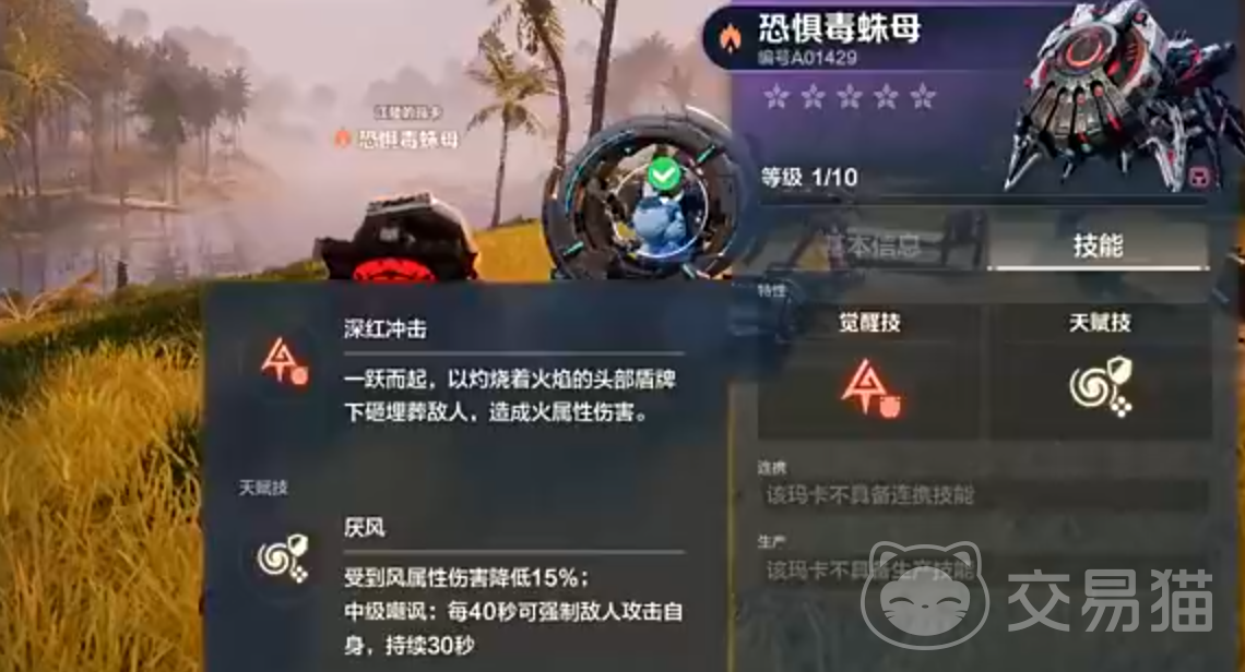 毒蛛母是火属,它的觉醒技在释放后会一跃而下,一灼烧着火焰的头部盾牌下砸敌人,造成火属性输出,它的天赋技“厌风”会让自己遭受到的风属性伤害降低15%,并且每40秒会强制敌人攻击自己一次,持续30秒,升到3星会解锁“厌风连接”让队伍里所有玛卡受到的风属性伤害全都降低15%,升到4星会解锁“过量充能”让队友们充能速度提升15%。