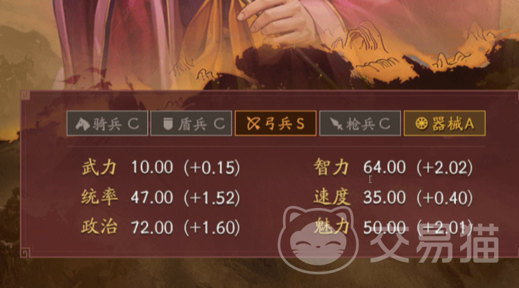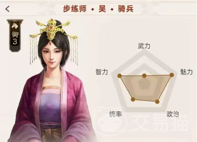 她是吴国的六御武将,属性面板的具体情况就放在下图。自带的战法是“淑懿之德”,在战斗时,己方的主将每拥有1种功能性状态,都能使其智力、统帅提高3%,从第三个回合开始,每回合有50%的概率使其对敌军的单体造成一次谋略伤害,伤害率为25%。这是一种指挥战法,全兵种都是适用的。