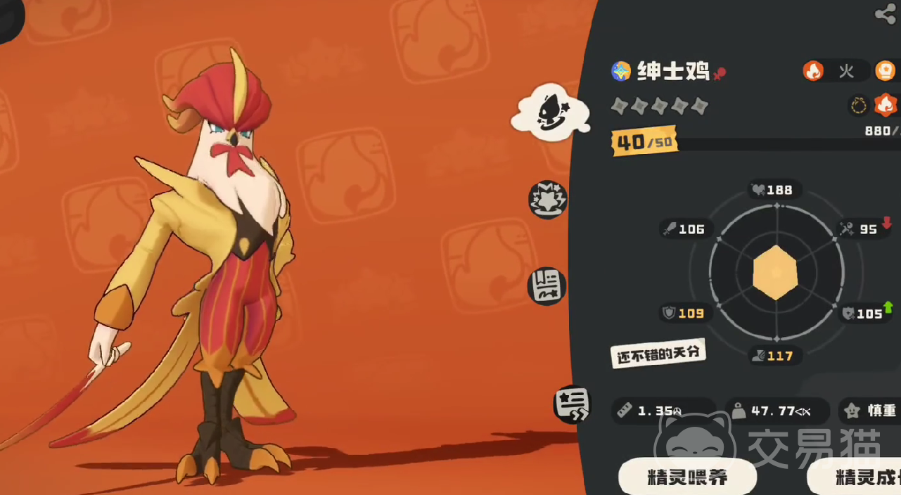 绅士鸡在游戏当中,属于火属性的高爆发性输出类角色,他擅长物理攻击和魔法攻击,基础面板拥有106点的高攻击数值,并且附带有188点的生命数值。