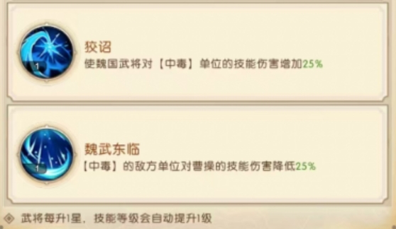 还有狡诏技能,是可以带来中毒效果的,中毒往往是一种致命而阴险的攻击方式,而曹操所具备的狡诏技能,能让魏国武将在面对中毒单位时,展现出独特的优势,当敌人陷入中毒状态时,魏国武将对其释放的技能伤害将额外增加 25%,这意味着在战斗中,一旦敌方有单位不幸中毒,魏国武将就可以抓住这个机会,用更加猛烈的火力压制对方。