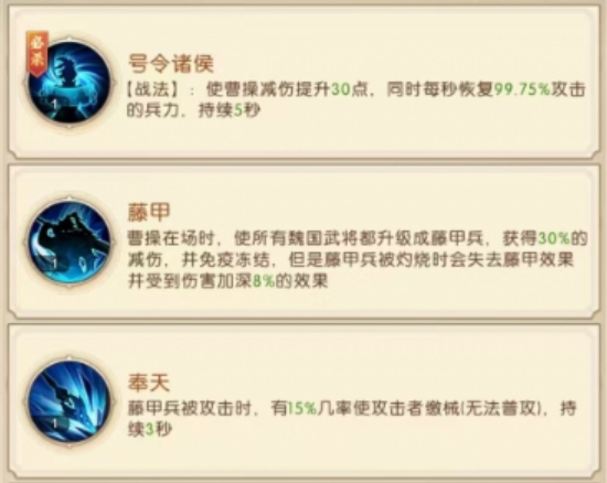 奉天技能是在激烈的战斗中,魏国武将所统领的藤甲兵,在遭受攻击时,都有一定几率触发,这个神秘的技能有着15%的几率,让攻击者陷入缴械的困境。一旦被缴械,攻击者将无法进行普通的攻击动作,这种状态将持续3秒。