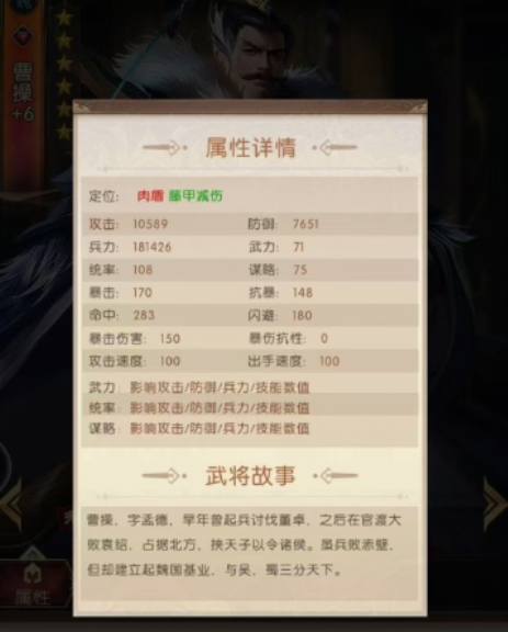 曹操在游戏中的获取方式相对稀有,玩家需要通过参与特定的活动,或者积累抽取100个武魂碎片才能将其纳入麾下,当曹操加入战斗时,他能够提升整体兵力的防御力,增幅高达20%,随着曹操星级的提升,他所带来的增益效果也愈发高,不仅整体怒气和攻击力会在开场时得到额外的提高,而且他的战法号令诸侯更是威力惊人,这一技能能够为曹操减伤30点,同时它还能每秒回复相当于99.75%攻击兵力的生命值,这意味着曹操在持续作战中几乎可以保持满血状态。