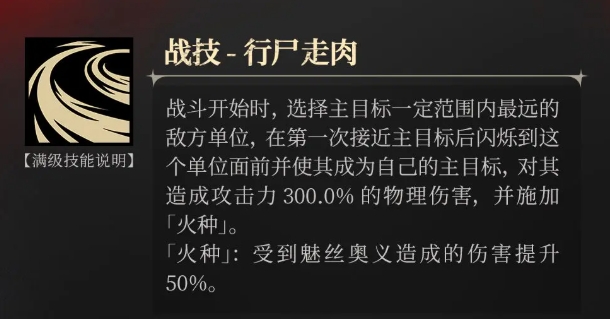 在用这个角色的时候,大家可以在战斗开始后直接使用她释放战技,战技的效果是选择主目标一定范围内最远的敌方单位作为目标,在第1次接近主目标后,她能够利用闪烁技能瞬间移动到这个单位面前,并使其成为自己的新主目标,这一过程中,她不仅能对敌人造成300%的物理伤害,还能施加火种状态,这个火种状态是专门对自身生效的,带有火种的目标在受到魅丝的奥义技能时都会提高所造成的伤害,提升了魅丝的输出能力。