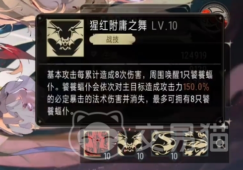 而拉米娅的战技猩红附属之舞更是强大,当每次基本攻击累计达到 8次伤害后,会在周围召唤出一只饕餮,召唤物也是输出效果的,它可以找到一个目标,依次造成150%攻击力的必定暴击法术伤害,随后消失不见,这里需要特别注意的是召唤蝠仆的条件是累计造成 8次伤害,而非简单的两次基本攻击,若战场上的目标数量有限,普攻无法完成 4次弹射,那么就无法满足召唤条件。