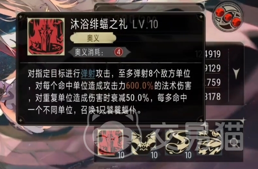 而拉米娅的奥义技能沐浴绯蝠之礼,使用的时候会对指定目标发动一次迅猛的弹射攻击,这枚携带着强大能量的攻击至多可弹射 8个敌方单位,每一个被命中的敌人,都将迎来600%攻击力的法术伤害,然而如果有敌人再次被这波攻击命中,那么他们所承受的伤害将出现50%的衰减,每当奥义技能多命中一个不同的敌方单位,一只饕餮蝠仆就会被召唤而出。