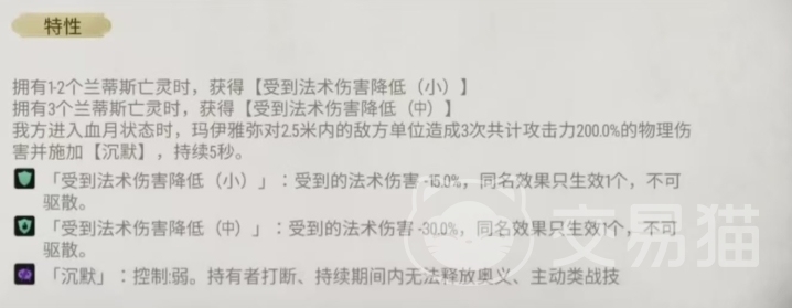 玛伊雅弥立约的基本攻击是能够对主目标造成总计188%攻击力的物理伤害,这样的伤害输出在基本攻击中是绝对不差的,其特性更是与兰蒂斯亡灵紧密相连,当拥有1-2个兰蒂斯亡灵时,她能获得受到小型法术伤害降低的效果,这在一定程度上提升了她在面对法术伤害时的生存能力,而当拥有三个兰蒂斯亡灵时,她所获得的中型受到法术伤害降低效果则更进一步增强了这种防御属性。