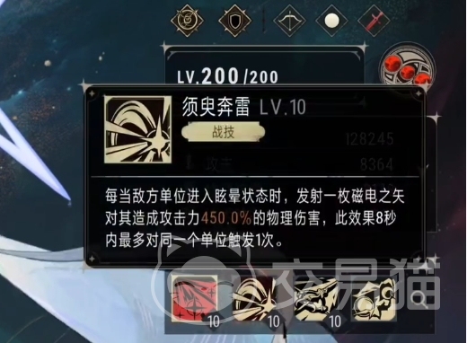 除了普通攻击和特性,克萝丝的战技同样威力很大,每当敌方有单位被眩晕,她就会发射出一枚磁电之矢,对目标造成 225%攻击力的物理伤害,这一伤害数值相当可观,而且8秒之内该效果只能对同一个单位触发一次,这一限制既保证了战技不会过于频繁地对同一目标造成不合理的高伤害,又确保了其能够持续地对敌方不同单位产生威胁,在战技造成伤害的同时,还会额外减少目标能量。