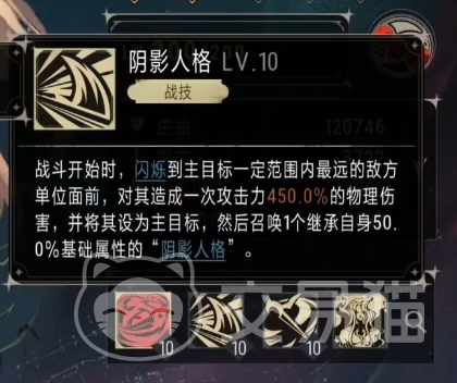 魔兰的战技效果同样是不错的,在战斗的一开始使用这个技能的时候,她会精准地选择主目标三米范围内最远的一个敌方单位作为生效目标,后续在战斗中,当魔兰第1次接近主目标后,她便会原地召唤出阴影人格,这个阴影人格并非寻常之物,它拥有魔兰50%的属性,且持续12秒钟之久,更为惊人的是阴影人格并不需要玩家操控,它会自动寻找距离最近的目标进行基本攻击。
