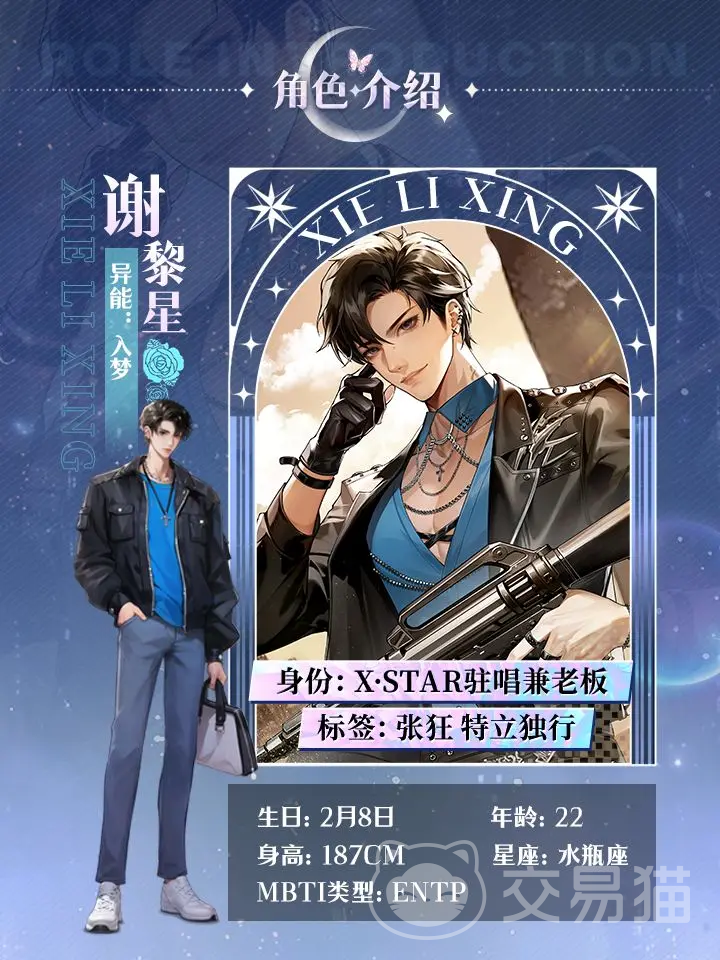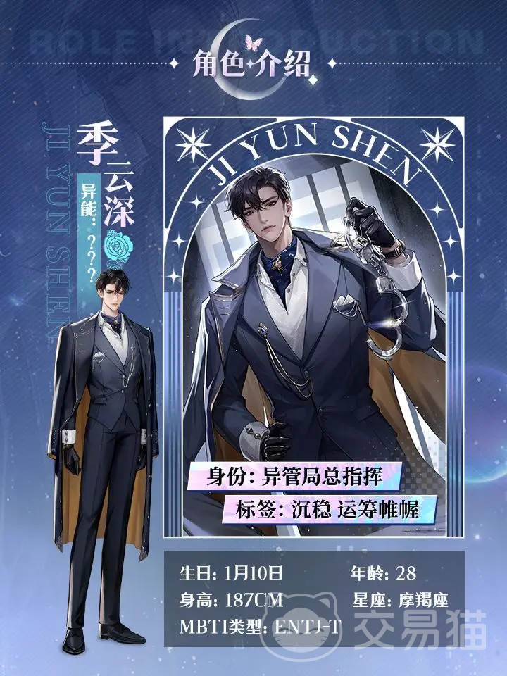 第三个谢黎星,22岁,身高187cm,水瓶座,作为X·STAR驻唱、老板,还是自由基金会高层;孤儿院成长的他有着游戏人生的态度。第四个季云深,28岁身高187cm,摩羯座,是异管局现任指挥官,女主在委托中进入了他的梦境,后续他就成为了自己的顶头上司。