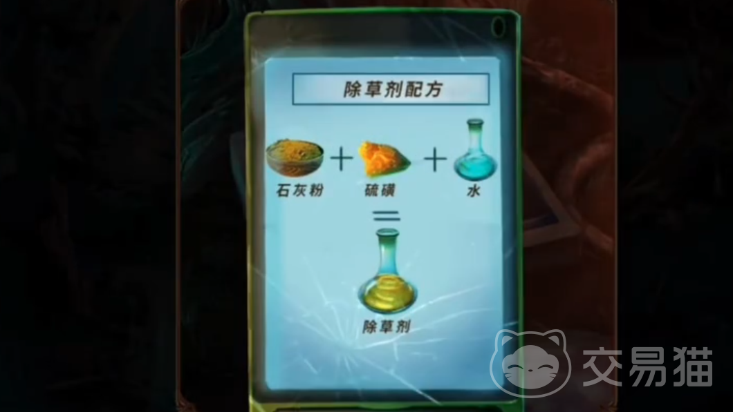 我们点击左下棋盘能得到配方,使用空水囊得到水,使用配方依次加入石灰粉、硫磺和水后能得到除草剂,继续向前走对着怪树使用除草剂,就能得到蝙蝠护身符,将其给凯特,任务就到此完成了。