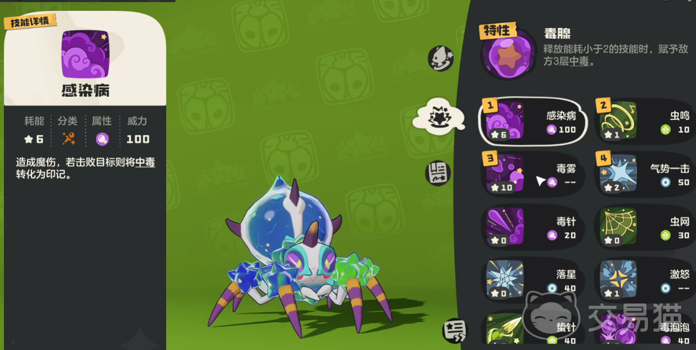 芋香巨角蛛的技能核心在于毒属性技能的持续伤害与控制效果。推荐的基础搭配以“毒网困缚”作为主打技能,该技能不仅能够对敌人造成毒伤,还能降低对手的速度,使其难以对抗芋香巨角蛛的持续压制。“剧毒喷涌”则是另一个必备技能,这个技能能够造成较高的毒系伤害,并有一定概率让敌人进入中毒状态,在面对高血量目标时尤为有效。由于芋香巨角蛛的生存能力较强,它可以利用这些技能与敌人进行拉锯战,确保对手在不断被削弱的状态下失去战斗能力。