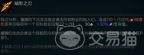 魔腾的技能组合中,普攻是他的主要输出方式。被动技能“暗影之刃”每隔一段时间,魔腾的下次普攻会造成额外的物理伤害,并根据命中的敌人恢复一定生命值。这个技能不仅可以暴击,还能享受无尽之刃的暴击加成,使得魔腾在团战中能够持续输出并快速恢复生命。每次普通攻击都会减少“暗影之刃”的冷却时间,尤其是攻击野怪或敌人时,冷却时间能够减少得更快,从而加速技能的循环。