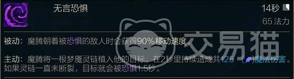 E技能“无言恐惧”则是魔腾的控制技能。通过将恐惧效果附加在敌人身上,魔腾能够让敌人短时间内无法移动,并且造成一定的魔法伤害。如果敌人未能及时脱离技能范围,将会被恐惧效果持续。这个技能能够有效限制敌方输出,尤其是在魔腾进行击杀时,能够起到决定性作用。