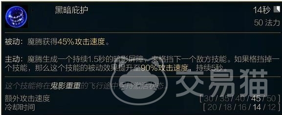 W技能“黑暗庇护”提供了魔腾的攻速加成,并且可以制造一个魔法盾,吸收敌人的伤害。当魔腾成功抵挡敌人的技能时,盾的效果会提升一倍。值得注意的是,在魔腾使用R技能“鬼影重重”进行冲刺时,魔法盾的持续时间不会减少,直到魔腾达到目标。因此,在飞行过程中,魔腾可以保持更高的生存能力,极大提升其抗压能力。