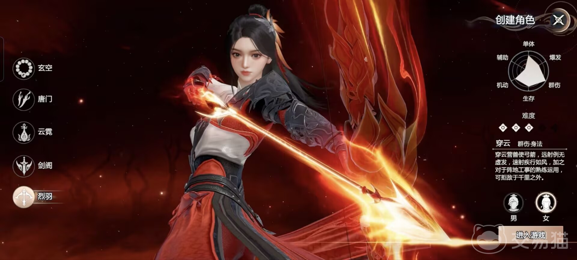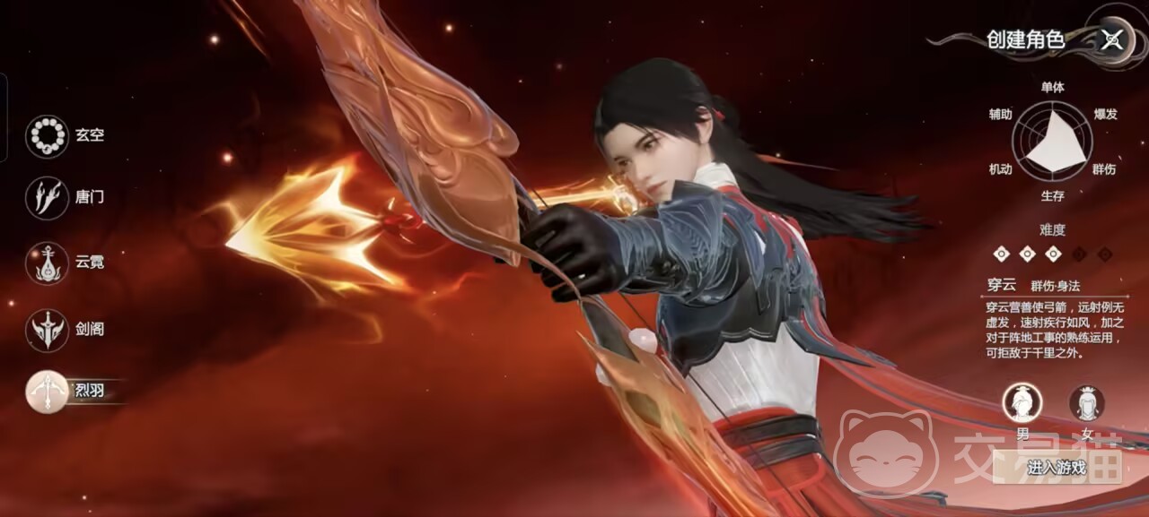 烈羽的技能有流火和满弓两种。使用流火技能,玩家将对选定的攻击区域释放跟雨点一样密集的箭矢,并且造成范围燃烧伤害;使用满弓技能,玩家首先要跟敌人保持最远距离,蓄力攻击,释放就可以一箭破万军的伤害。