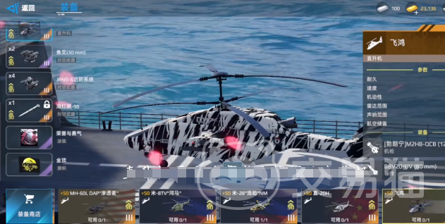在直升机这一方面也有一些选择,例如可以选用飞鸿或性能更优的机型。这样的配置不仅会有远程打击,而且还会有反潜的能力。在进入到实际战斗的过程中,开局就会被队友顶开,此时就会影响到作战的节奏。发射的导弹也会被敌方拦截输出会受到一些限制。