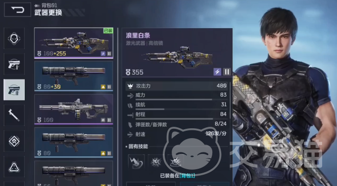 另外还可以选择四维势,这是一把突击步枪,在对战的时候可以加装上中倍镜,这就表示玩家可以击中更远距离的对手,除了较远的射程之外,枪械的续航能力也是非常优秀的,浪里白条也是比较推荐大家去使用的一把枪械,这是一把更加独特的激光武器,上面可以加装高倍镜,这也就代表了枪械的射程是比较远的,虽然整体的续航能力并不优秀,但是枪械的威力巨大,非常适合对战各种不同的对手,这两把都是电属性的武器,非常适合进行后期排位对战。