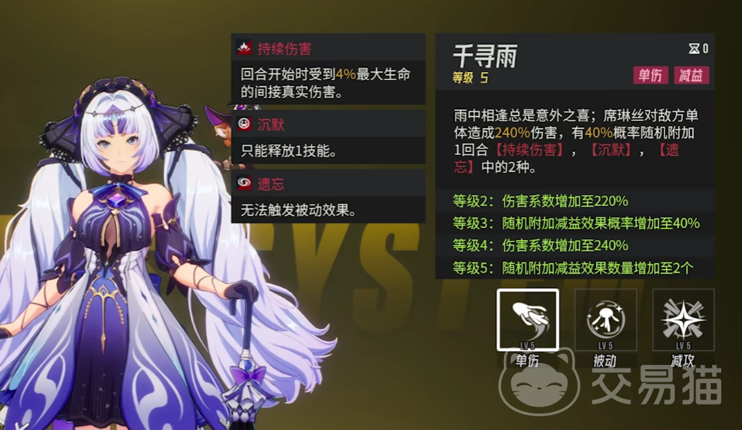 席琳丝总共拥有四个战斗技能,第一个战斗技能叫做千寻雨,实际上就是席琳丝的普通攻击技能,冷却时间是零回合,它可以对敌方单体目标,造成基础攻击倍率为240%的伤害,并且有40%的概率,附加一个回合的持续性伤害以及沉默。
