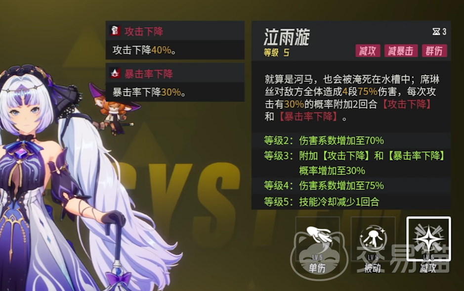 席琳丝的终极技能叫做泣雨漩,冷却的时间为四个回合,她可以对敌方全体目标,造成四段基础攻击倍率为60%的伤害,并且每段伤害有40%的概率,可以对敌方附加两个回合的防御数值降低buff。