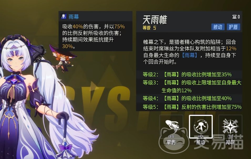 第二个技能是天雨帷,该技能冷却时间是零回合,席琳丝可以为全体的队友目标,附加相当于自身生命数值12%的护盾效果。