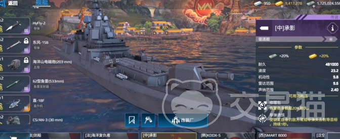 承影一号槽位是两自由导弹垂发前置,锁定导弹东风15B还是会比较受到大家关注,单发伤害可以达到39,000,一轮伤害达到78,000。在实际测试的过程中,如果面对的是3个126D和4个海鹰西格玛的058,经过多轮攻击之后,还是可以实现突防整体的表现是很不错的。