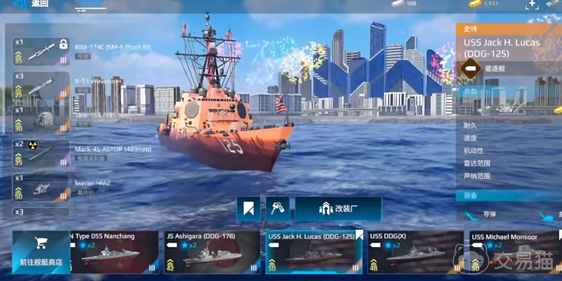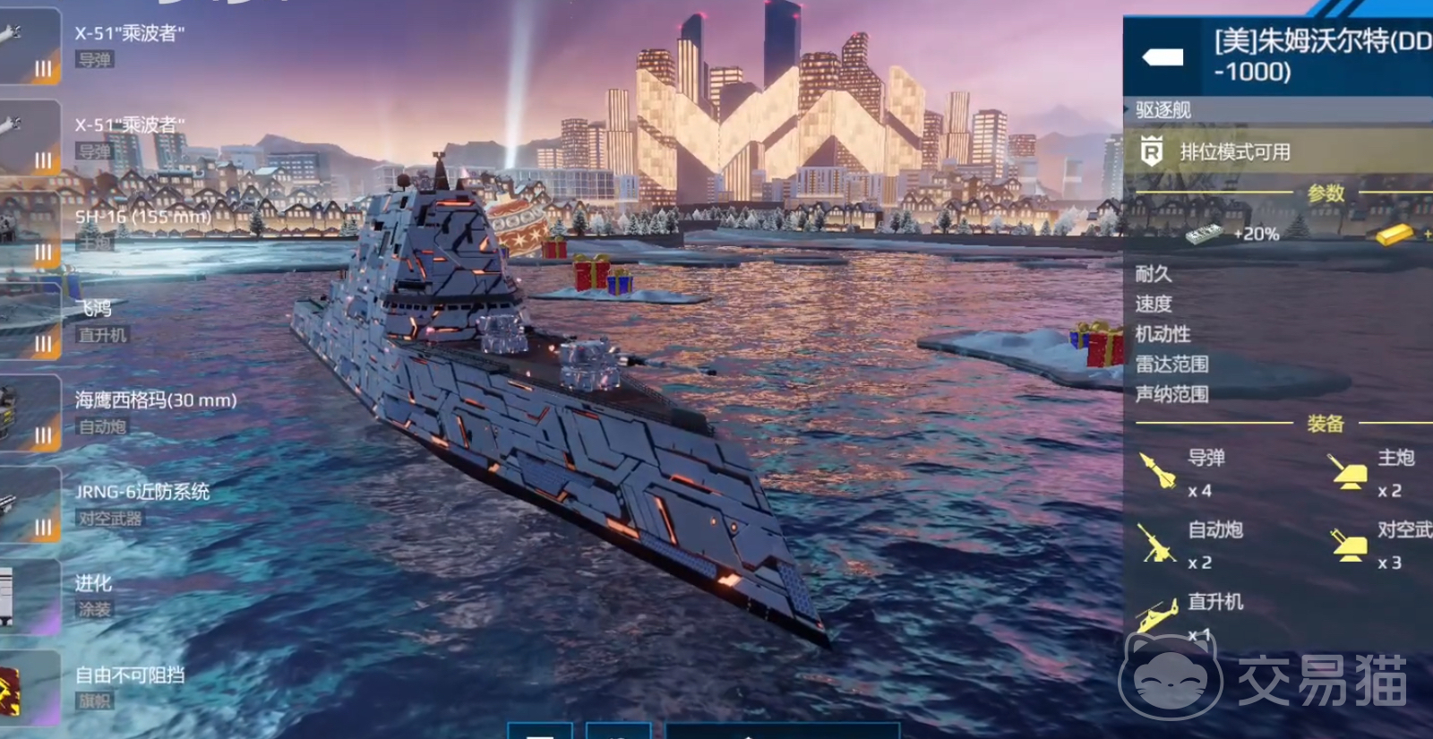 第一艘朱姆沃尔特级驱逐舰,美国战舰,它的特点是拥有先进的隐身设计技术,机动速度和雷达探测距离表现十分优秀,而且远程火力投送能力也不弱,对于技术性玩家来说,这个强度是毋庸置疑的。