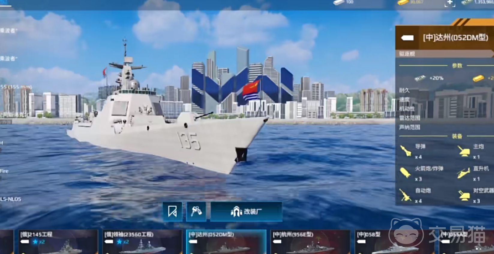 第九艘052DM达州,豪华的火力配置系统,直逼30万的单轮强制伤害值,并且在防空和反潜能力上都非常不错,全面型战舰,值得入手。