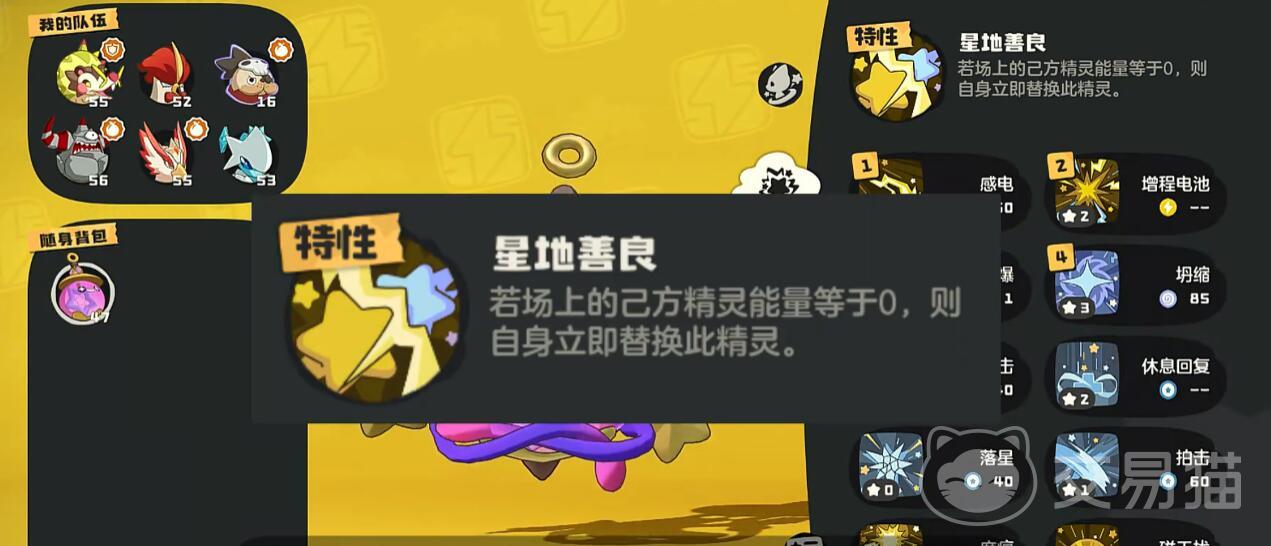 小皮球由粉粉星进化而来,获取门槛中等但操作上限极高,适合追求灵活战术的中后期玩家。而特性使其成为能量循环战术的核心,例如队友释放高耗能技能后,可无缝衔接入场触发增程电池(电系技能威力+30)。技能组推荐落雷(魔伤+进场增益)+麻痹(减速50%)+冥想(魔攻强化)+闪击折返(连击+离场)。战斗时先手麻痹限制敌方速度,随后“冥想”提升魔攻50%,利用落雷叠加伤害,最后闪击折返脱战并触发特性换人,形成循环的永动机玩法。