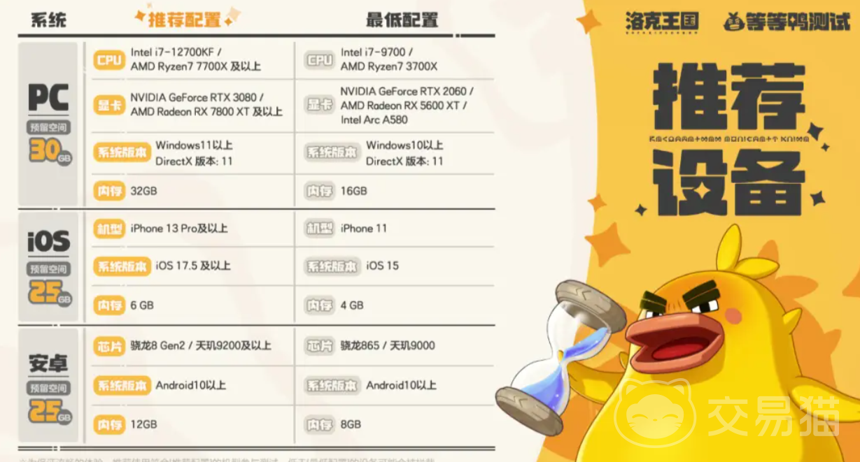 针对于手机端玩家,应当分为安卓端和IOS端,针对安卓端,需要搭乘芯片骁龙865,亦或是天玑9000,在安卓系统的选用上面,应该选用版本为10以上的安卓系统,内存空间预留八个GB,存储空间需要预留五十个GB以上。
