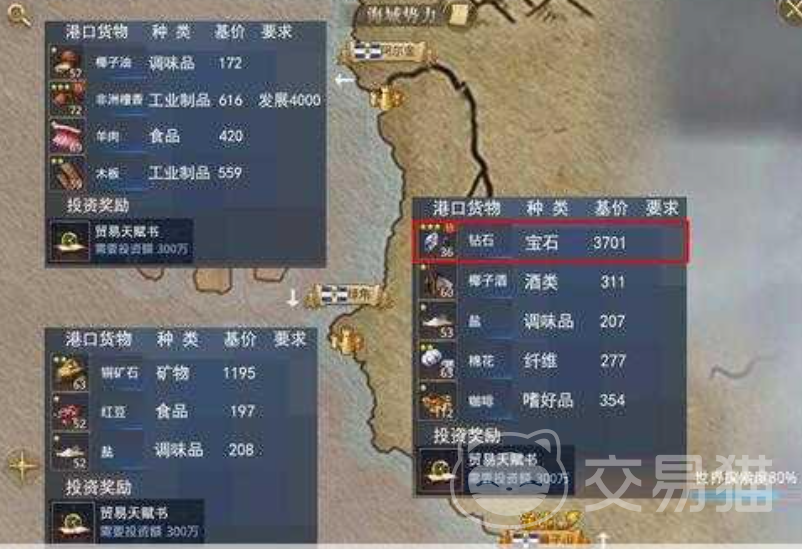 在南非金钻三港作为长途跑商的地点,那需要进的货物为金子和钻石,具体的获取方法为先前往阿比让或者狮子山等地方投资,先把金子和钻石给解锁了,然后在把准备好的三级进货书给拿出来,用三级进货书把商品全部购买满,在回到地中海地区直接销售就行了。