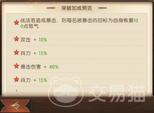 枭姬技能则每次释放战法都能使战法伤害提升15%,最多可叠加 3层,随着战斗的进行,她的输出能力会逐步增强,在战斗的中后期能够发挥出更为恐怖的潜力,孙尚香在突破之后,战法若造成暴击,每名被暴击的目标会为自身恢复100点怒气,这一突破属性进一步提升了她的战斗续航与输出能力,其攻击属性提升 10%,使得她在战场上的普攻与技能伤害都能有增加。