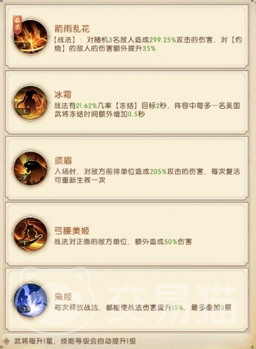 她的大招叫做箭雨乱花,具有强大的群体伤害能力,其战法效果是对随机 3 名敌人造成高达 299.25%攻击的伤害,并且如果目标处于灼烧状态,那么伤害还会额外提升 35%,这一特性使得她在面对有灼烧负面状态的敌人时能够提升输出效率,针对敌方带有灼烧效果的角色,都能发挥作用,冰霜技能的战法有 21.62%的几率冻结目标 2 秒,而且阵容中每多一名吴国武将,冻结时间还会额外增加 0.5 秒,这在团队战斗中能够有效地控制敌方单位的行动,配合队友的技能释放。