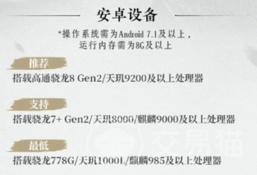 如果是安卓设备,那起码需要保证Android 7.1及以上,运行内存需为8G及以上。除此之外,也推荐大家选择高通骁龙8 Gen2/天玑9200及以上处理器,其余方面并没有什么太多的限制。